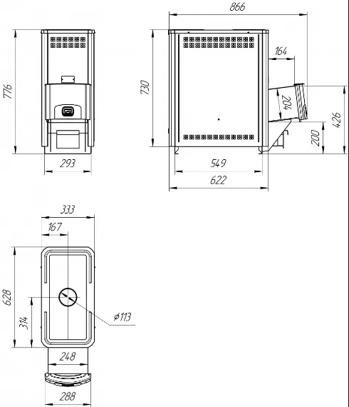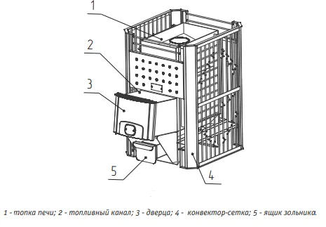 Печь имеет выносной топливный канал, позволяющий протапливать печь из смежного помещения. Печь комплектуется стальной дверцей с функцией самоохлаждения.