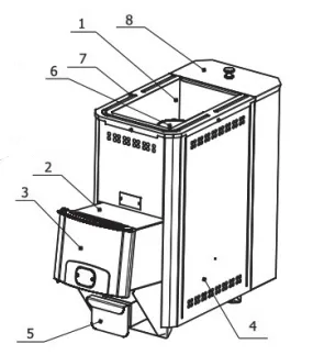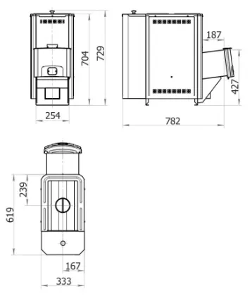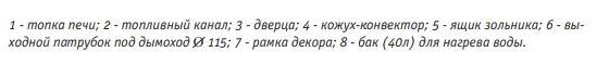Печь имеет выносной топливный канал, позволяющий протапливать печь из смежного помещения. Печь комплектуется стальной дверцей с функцией самоохлаждения и навесным баком.