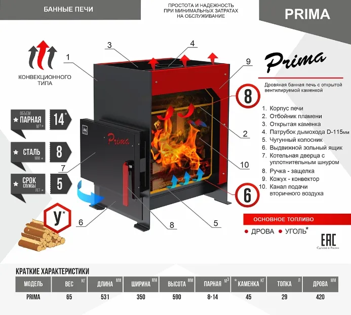 Печь PRIMA - это печь-каменка, изготовленная из конструкционной стали толщиной 6 мм. Элементы топки и каменки печи, несущие наибольшую термическую и механическую нагрузку, изготавливаются из конструкционной стали толщиной 8 мм., что позволяет топить ее не только дровами, но и каменным углем* при определенных условиях.