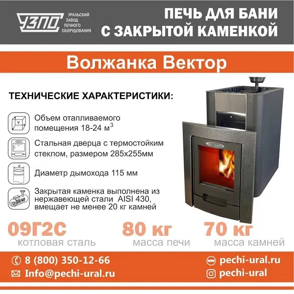 Печь «Волжанка Вектор с закрытой каменкой» предназначена для установки в помещении бани в целях создания необходимого температурно-влажностного режима. Главной конструктивной особенностью печи является наличие емкой закрытой каменки из нержавеющей стали, вмещающей более 20 кг камней. Также, реализована эффективная схема подачи воздуха в зоны активного горения, что значительно увеличивает КПД печи. В главной конструкции применена удобная и практичная схема подачи воды в закрытую каменку, что делает процесс генерации сухого пара внутри закрытой каменки простым и максимально безопасным.