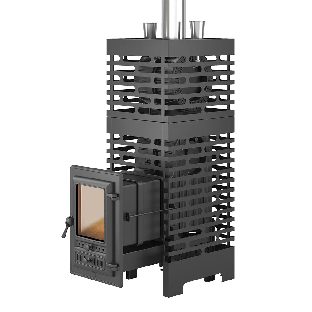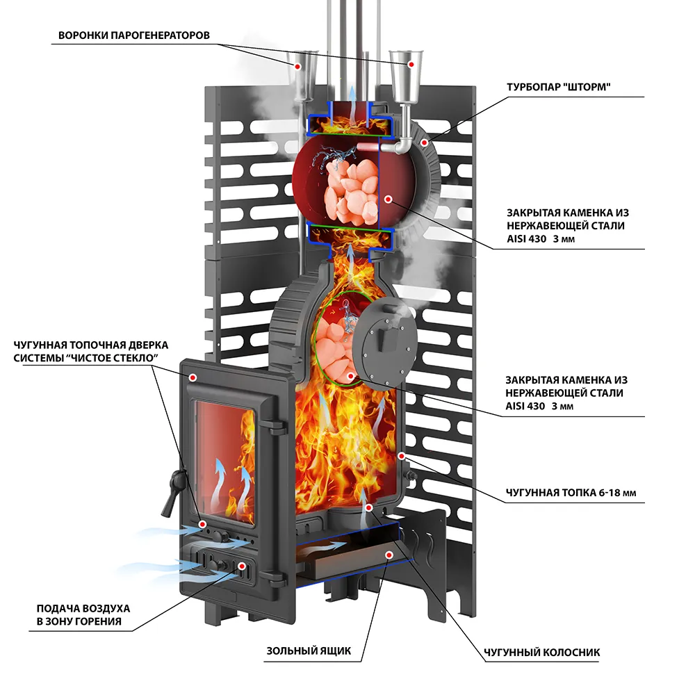 Для закладки камня предназначена цилиндрическая каменка из нержавеющей стали AISI 430, размещённая на пути пламени и горящих дымовых газов. Каменка рассчитана на 15-20 кг камней для бани, которые за счёт обтекания пламенем нагреваются до температур свыше 450°C. Для подачи пара предусмотрена воронка из нержавеющей стали, позволяющая через систему трубок подать воду на массив разогретых камней. Воронка размещена выше каменки печи, на одном уровне с воронкой натрубной каменки Турбопар Шторм. Для выхода пара предназначено специальное отверстие в боковой крышке каменки. Пар, под давлением выходя из каменки, выдаёт специфический звук порывов ветра. Дверь печи – чугунная, с системой регулируемой подачи воздуха для горения. Через отверстия в двери воздух проходит в поддувальное пространство и затем через чугунный колосник попадает в топочную камеру. Интенсивность подачи воздуха регулируется закрытием щелевидных отверстий в нижней части двери.