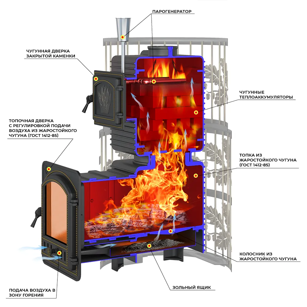 Печь состоит из двух модулей: топочной камеры и модуля каменки из чугуна. Наиболее термонагруженные участки печи сделаны из жаропрочного чугуна толщиной 20 мм. Для накопления теплового заряда в каменку размещают заклад из чугунных брусков (чушек) или камней для бани. При горении дров пламя напрямую нагревает заклад, что позволяет накопить достаточно энергии для получения качественного перегретого пара. Для увеличения площади теплоотдачи по всей поверхности печи устроено оребрение, за счёт которого чугун быстрее отдаёт тепло в окружающее пространство и способствует ускорению нагрева парной, каменного заклада и облицовки печи.