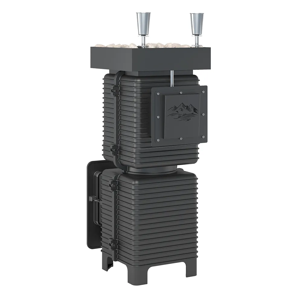 В качестве открытой каменки выше основной части печи может быть размещён стальной поддон для камней, куда умещается более 60 кг камня. Совокупный вес печи и заклада составляет более 400 кг.