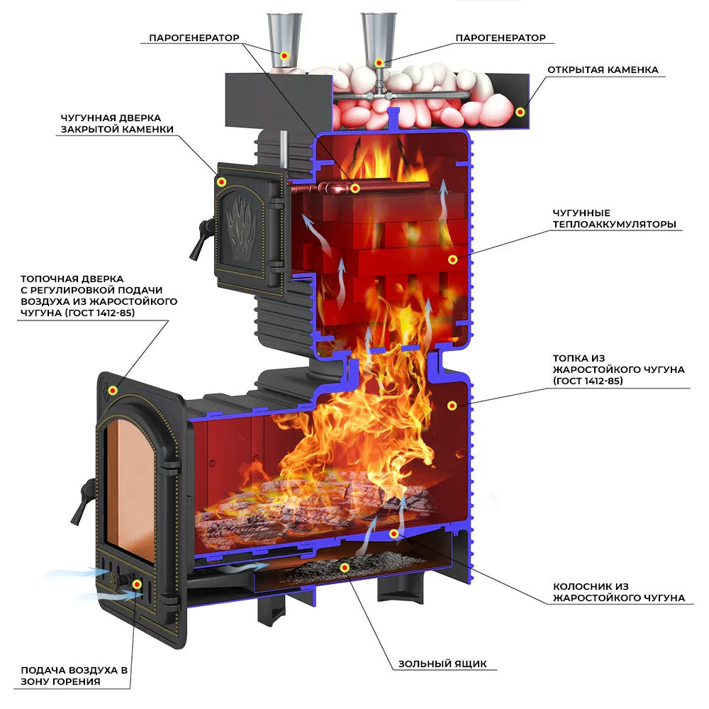 Печь состоит из двух модулей: топочной камеры и модуля каменки из чугуна. Наиболее термонагруженные участки печи сделаны из жаропрочного чугуна толщиной 20 мм.