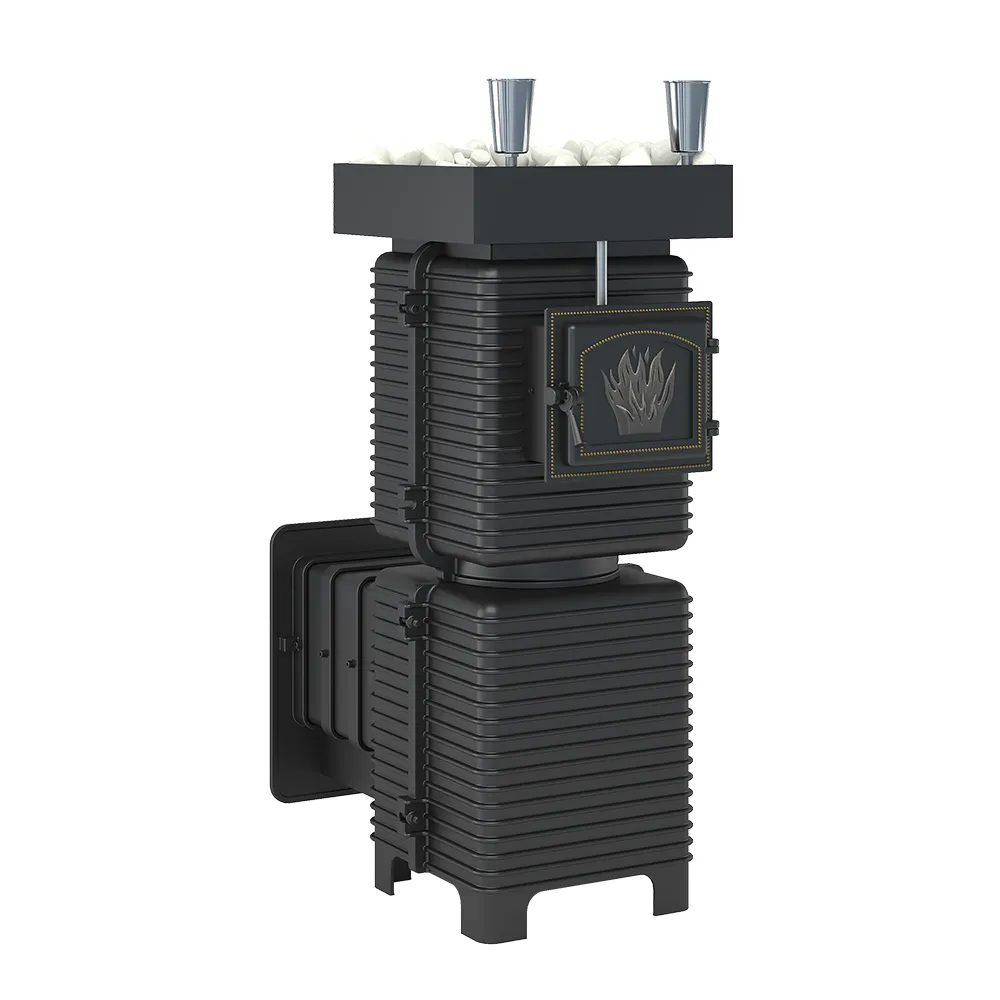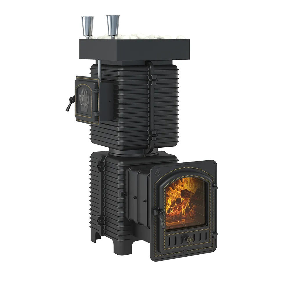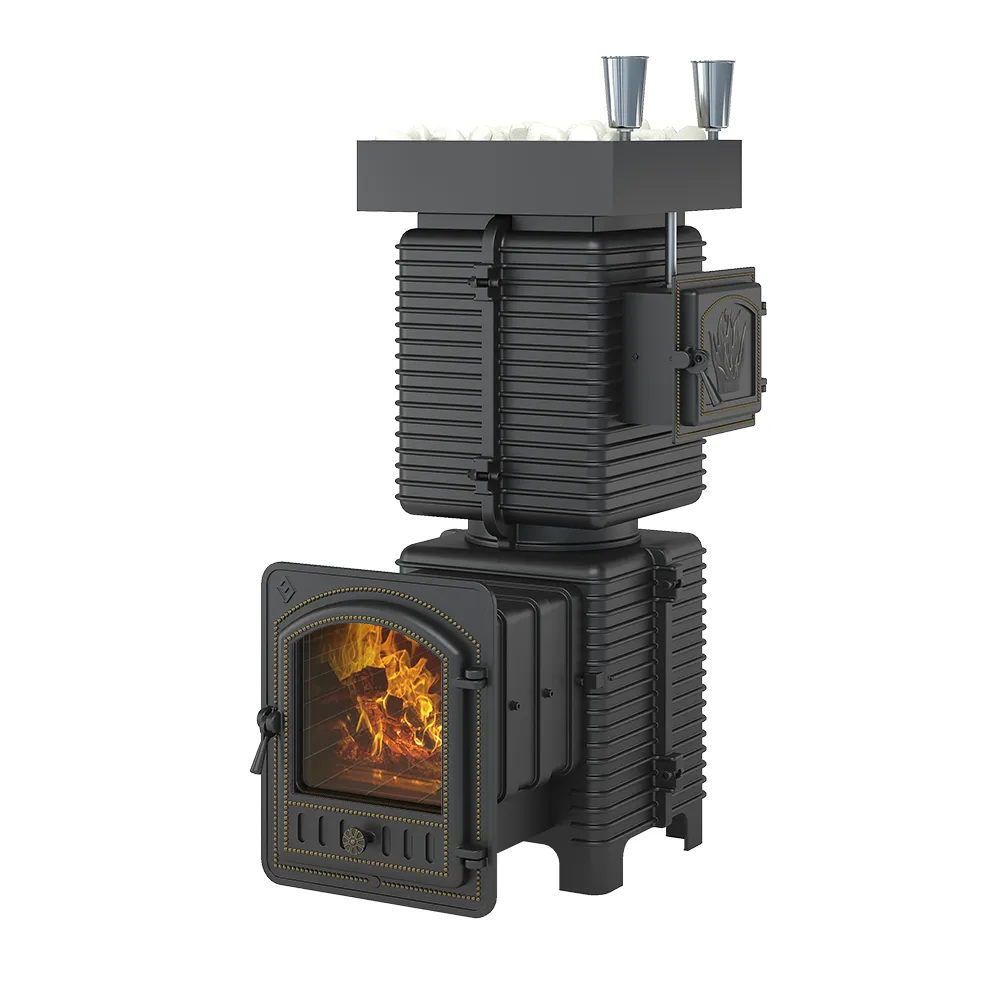 В качестве открытой каменки выше основной части печи может быть размещён стальной поддон для камней, куда умещается более 60 кг камня. Совокупный вес печи и чугунного заклада составляет более 400 кг.