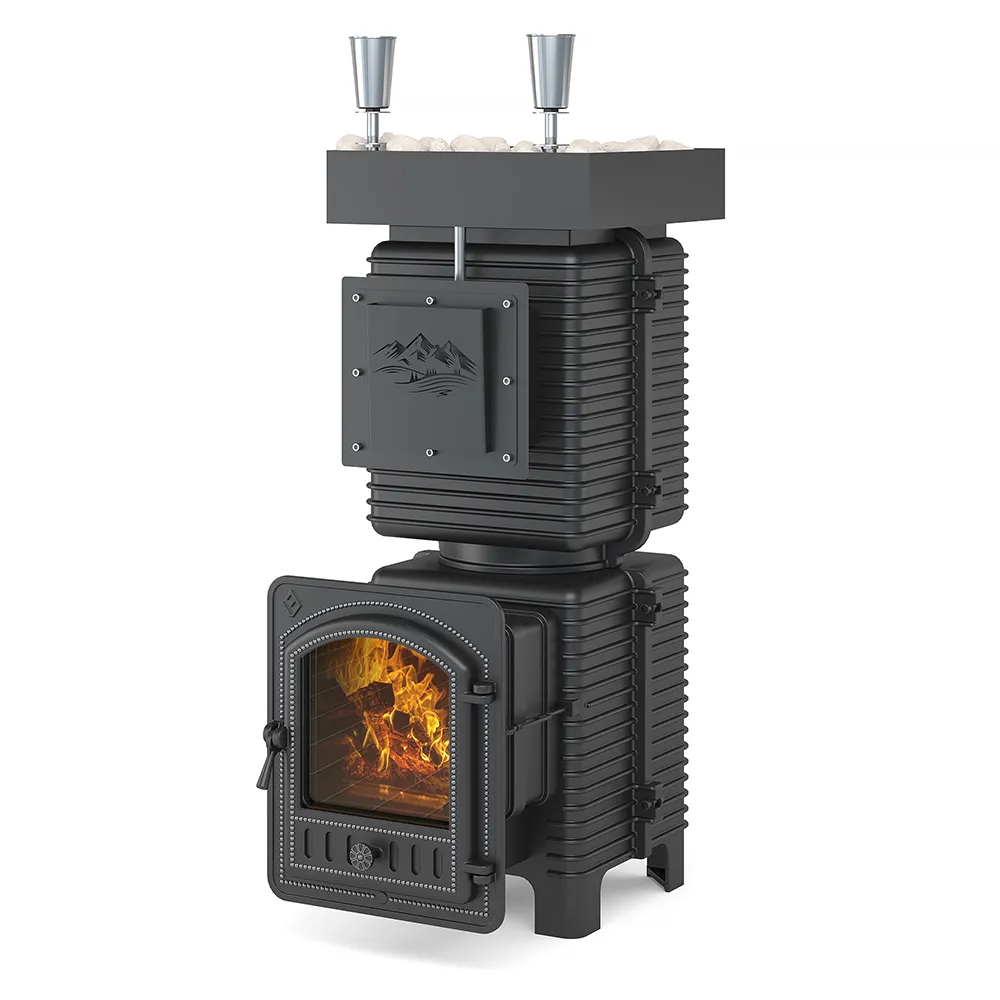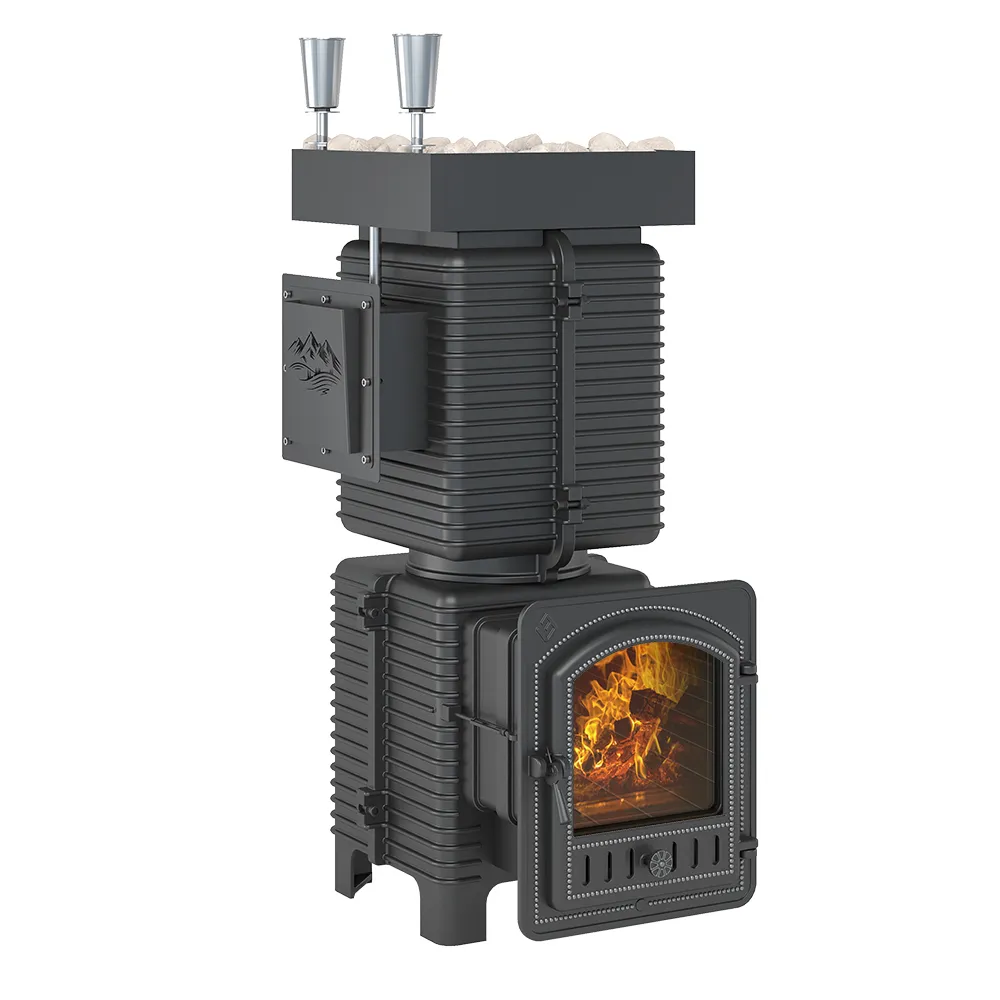 В качестве открытой каменки выше основной части печи может быть размещён стальной поддон для камней, куда умещается более 60 кг камня. Совокупный вес печи и заклада составляет более 400 кг.