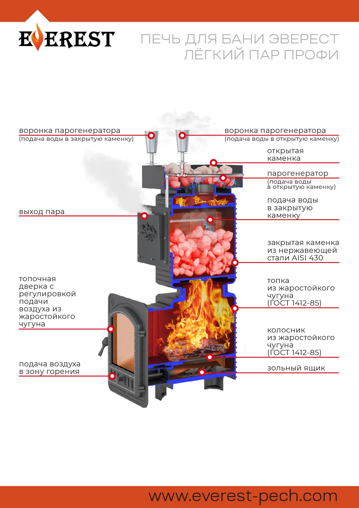 Печь состоит из двух модулей: топочной камеры из чугуна и закрытой каменки из нержавеющей стали. Наиболее термонагруженные участки печи сделаны из жаропрочного чугуна толщиной 20 мм.