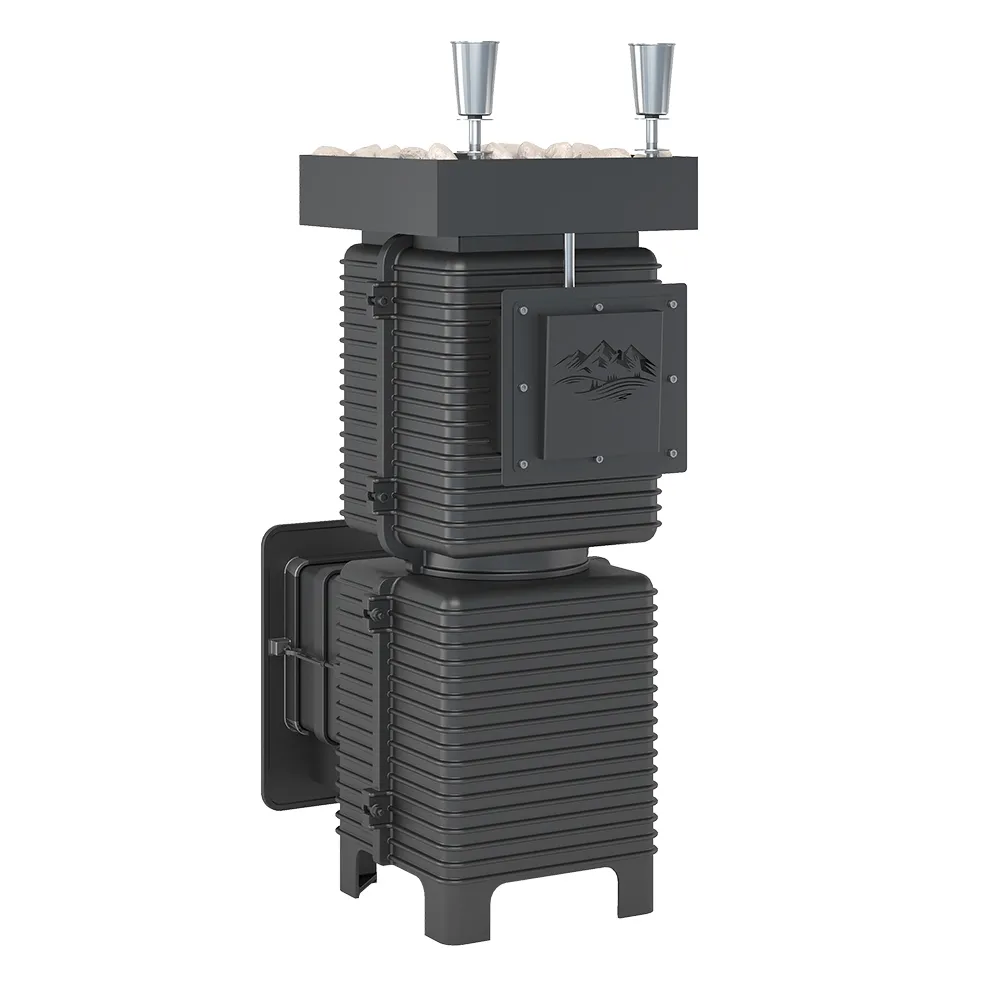 Для получения пара обе каменки печи EVEREST Лёгкий Пар ПРОФИ оборудованы парогенераторами. Парогенератор закрытой каменки зафиксирован в корпусе печи, а парогенератор открытой каменки укладывается между камнями в верхнем поддоне.