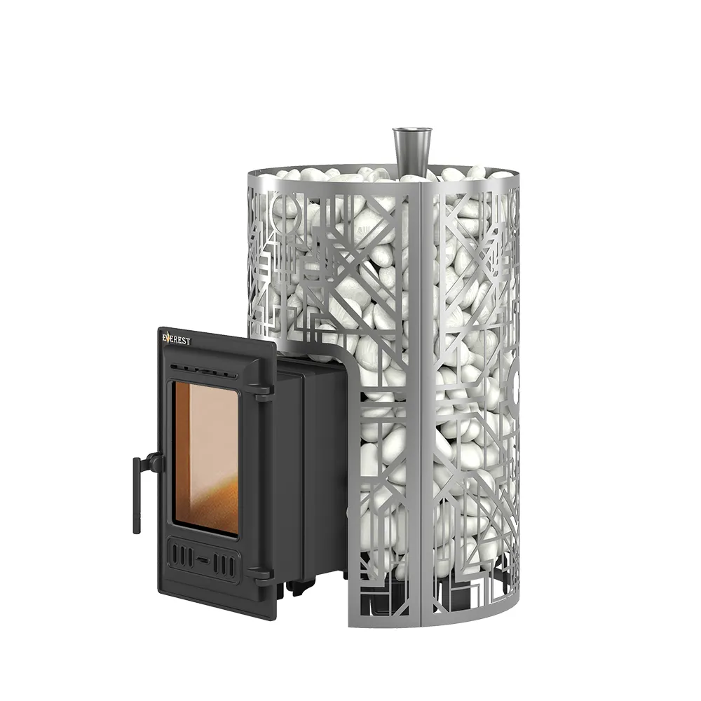 Внешний контур в виде сетки из нержавеющей стали толщиной 1 миллиметр вмещает в себя до 150 кг камней для бани. Сетка сделана в минималистичном дизайне Эверест.