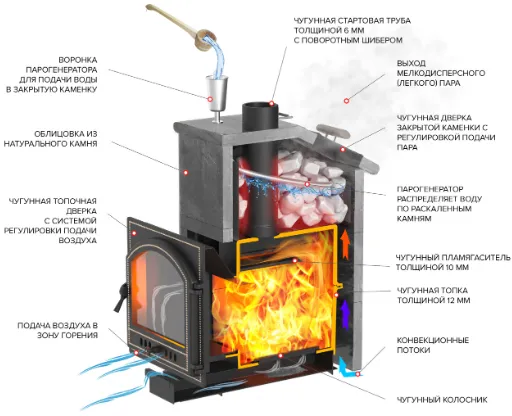 Печь изготовлена из жаропрочного чугуна толщиной не менее 10 мм, топка печи абсолютно герметична