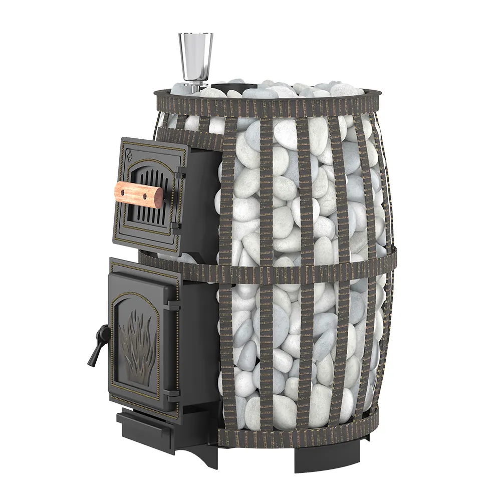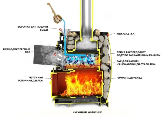 Вода подается в самую горячую центральную часть закрытой каменки через воронку (при этом дверь закрытой каменки должна быть приоткрыта для поступления мелкодисперсного пара в парное отделение). Все элементы топки отлиты из жаропрочного чугуна и соединены между собой с помощью болтового соединения через термостойкий шнур и герметик, а закрытая каменка изготовлена из жаростойкой высоколегированной 4 мм нержавеющей стали.