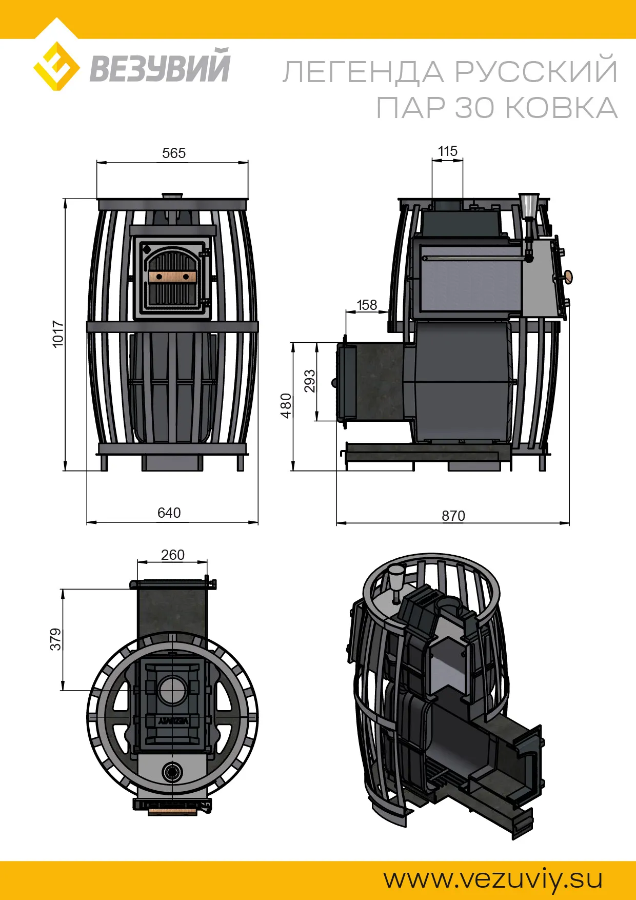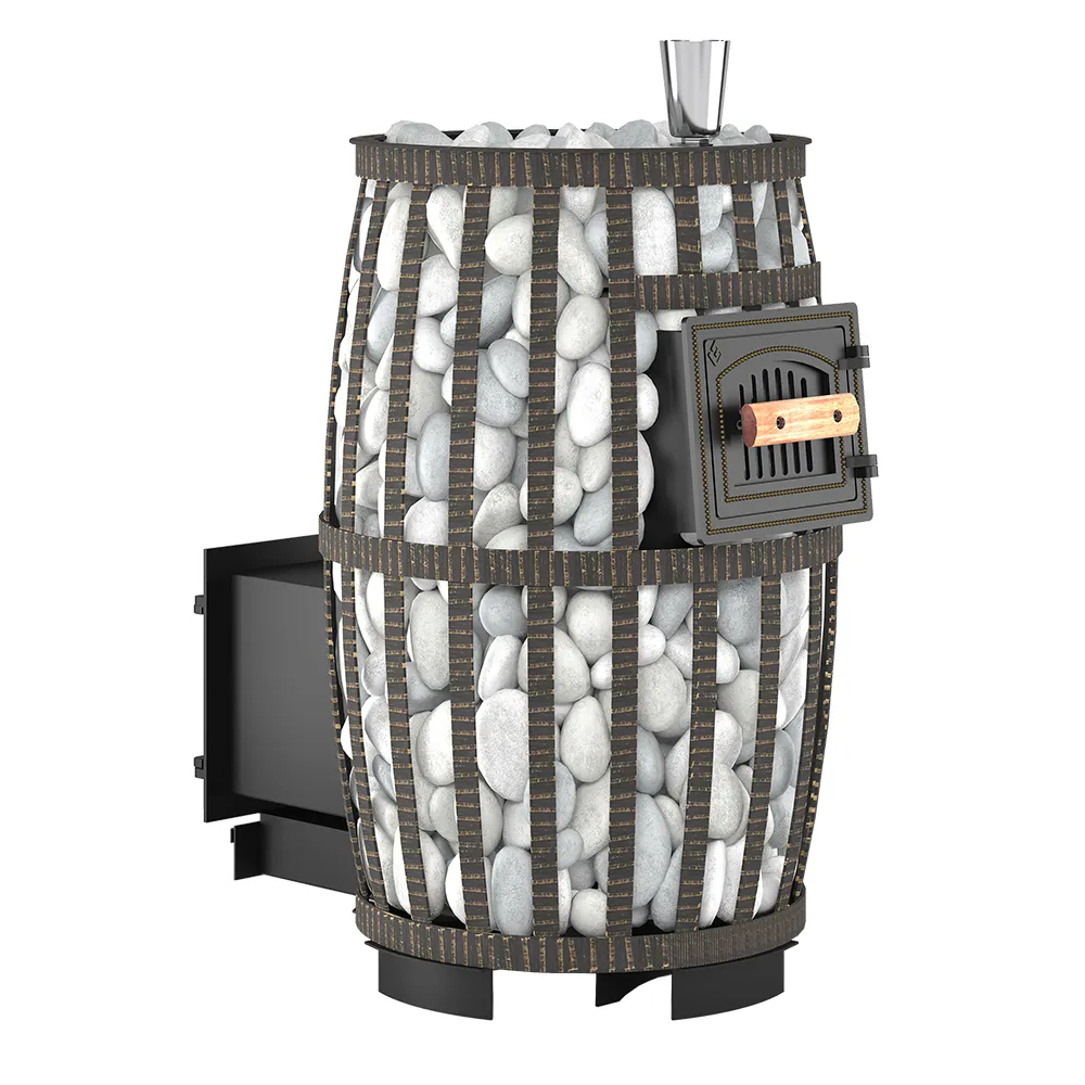 Новая линейка дровяных печей для бани Легенда Русский пар Ковка 30 (270) рассчитанные на парное отделение объемом от 14 до 30 м3. Легенда Русский пар Ковка 30 отличается от своей предшественницы дровяных печей для бани Легенда Ураган прежде всего наличием закрытой каменки, которая охваченная круговым потоком пламени, в которой камни прогреваются до температуры 600 °С, что позволяет создать в парилке наиболее благоприятный микроклимат, не пересушивая и не перегревая воздух.