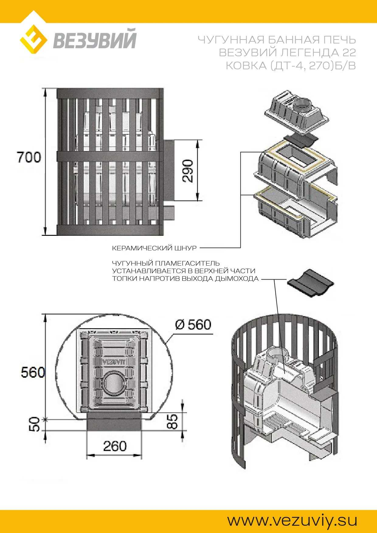 Печь изготовлена из жаростойкого чугуна (ГОСТ 1412-85), топка печи абсолютно герметична