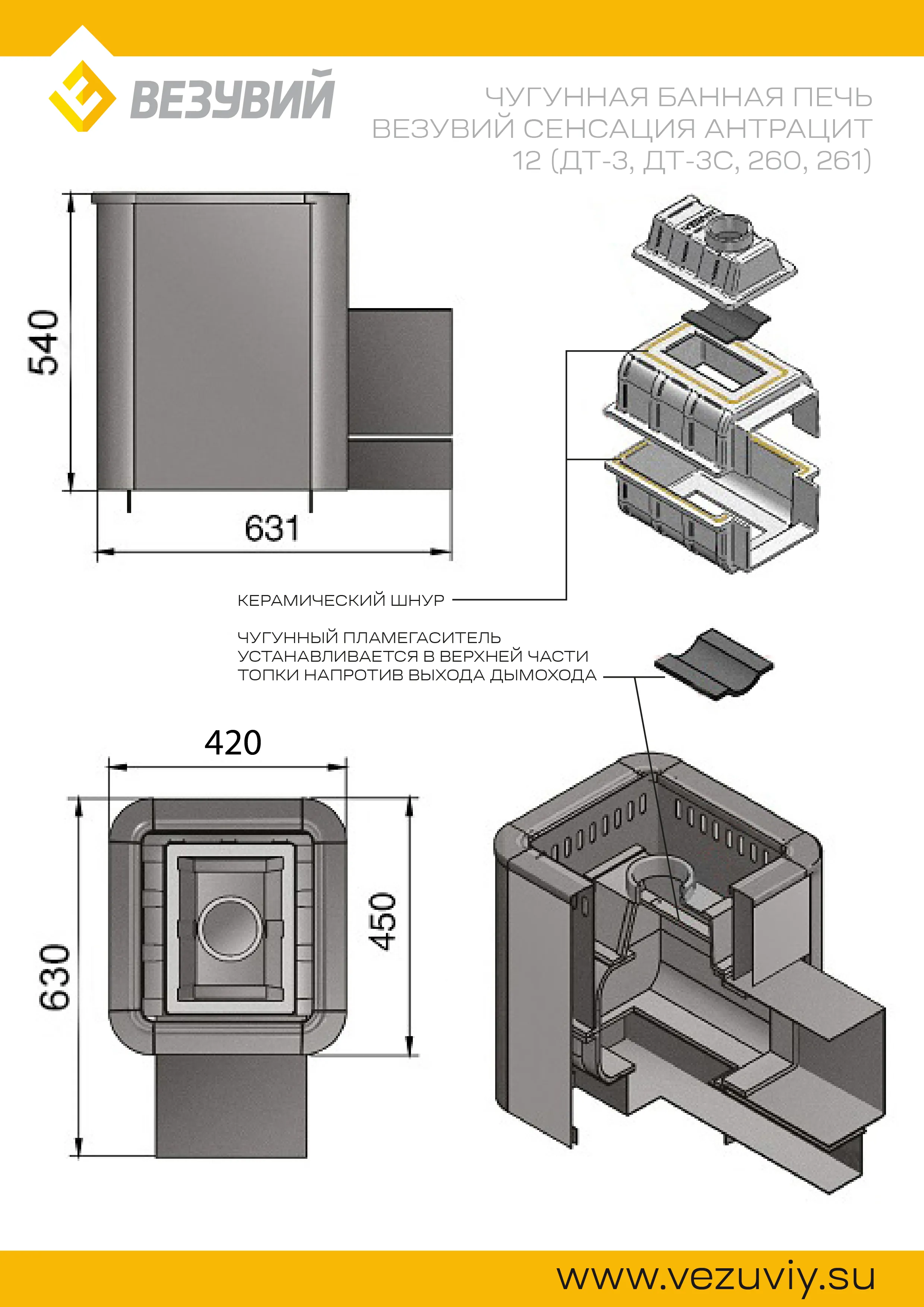 Банная чугунная печь Сенсация 12 Антрацит (Д-3) укомплектована чугунной герметичной дверцей Везувий 261. Объемная, вентилируемая каменка значительно ускоряет нагревание воздуха в парилке за счёт образуемого им мощного конвекционного потока. Топка печи состоит из 3-х элементов. На стыке между ними используется керамический шнур с рабочей температурой 1200 градусов. То есть топка печи абсолютно герметична! Для фиксации деталей между собой применяется болтовое соединение, что даёт 100% гарантию безопасности при эксплуатации.