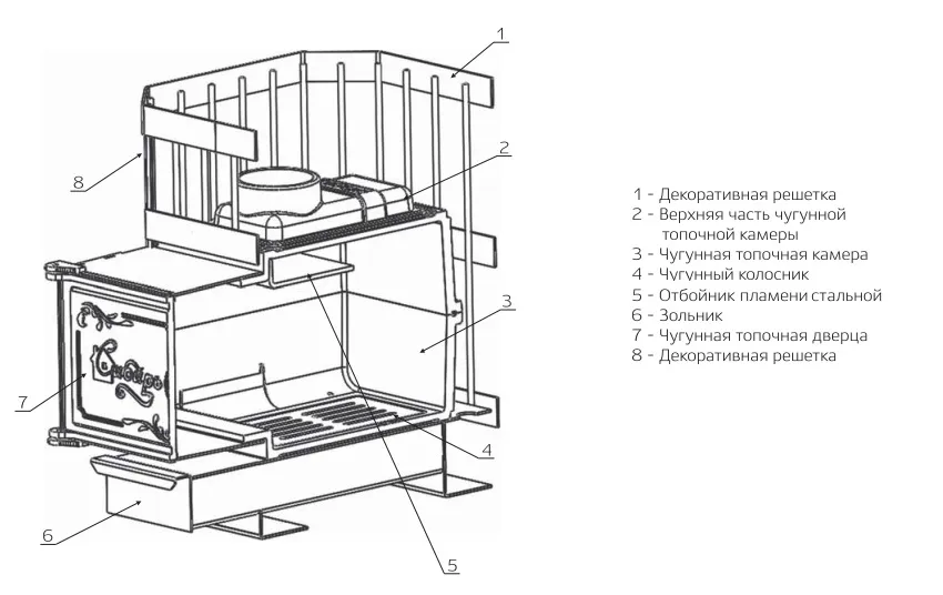 чугун является самым теплоемким, жаропрочным, коррозионностойким металлом, который выдерживает воздействие самых агрессивных сред. При высоких температурах он не подвержен деформации и способен выдерживать большие весовые нагрузки. Толщина стенок топочной камеры составляет 10мм
