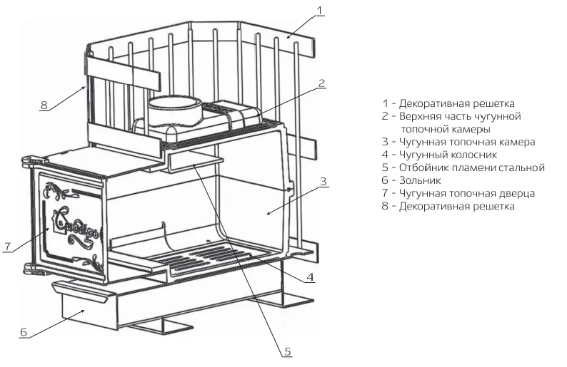 чугун является самым теплоемким, жаропрочным, коррозионностойким металлом, который выдерживает воздействие самых агрессивных сред. При высоких температурах он не подвержен деформации и способен выдерживать большие весовые нагрузки. Толщина стенок топочной камеры составляет 10мм