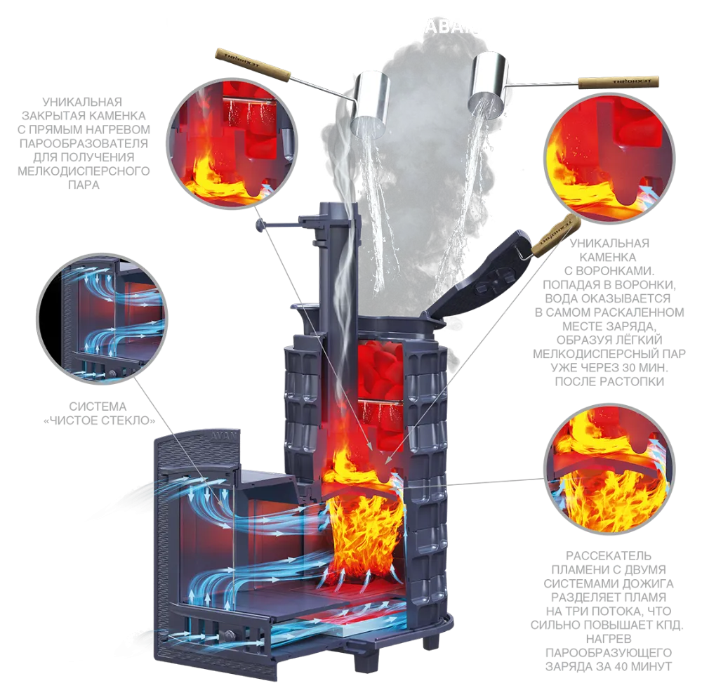 Закрытая каменка печи Аванград снабжена 2 воронками с подачей воды на разные уровни, а также есть возможность залповой подачи воды для создания режима Русской бани.