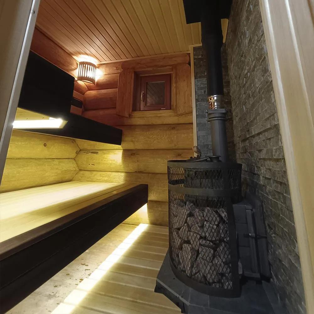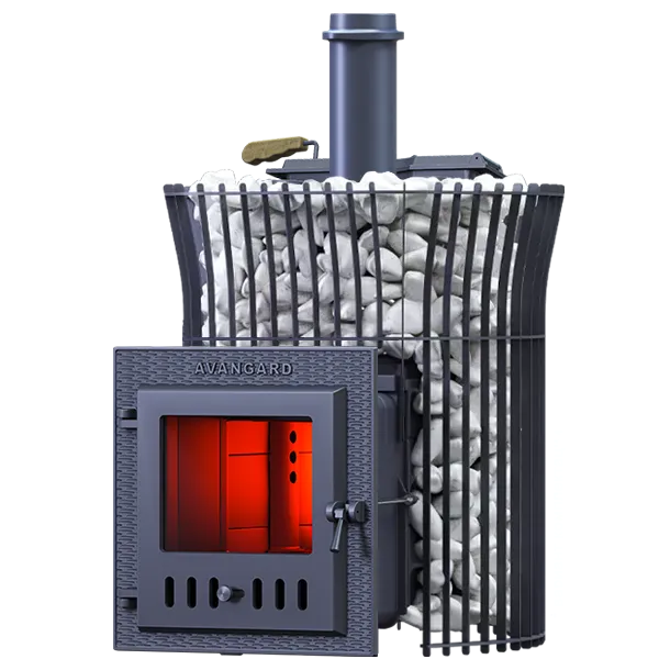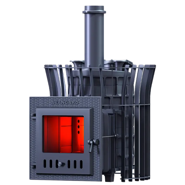 Масса пароиспарителя в печи AVANGARD 25– 42 кг, и он нагревается прямым контактом с пламенем. У пароиспарителя 2 поверхности с увеличенной рабочей площадью – снизу идёт нагрев огнём, а сверху поддаётся вода для пара. У печи уникальная, массивная каменка с теплонакопительными воронками, для получения легкого пара.