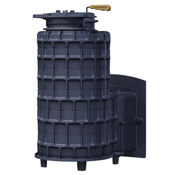 Каменка полностью закрытая - отбойником пламени является дно каменки, далее пламя обогревает цилиндр со всех сторон, при выходе в дымоход нагревается верх каменки. Под дымоходом выполнен скос для предотвращения скапливания сажи. Для предотвращения изгиба дня каменки предусмотрен надёжный чугунный упор.