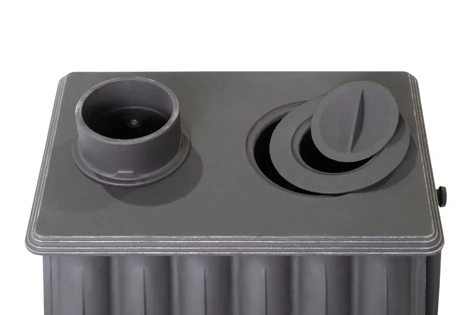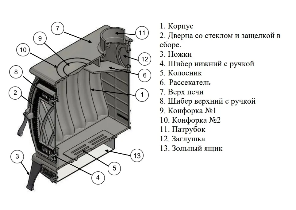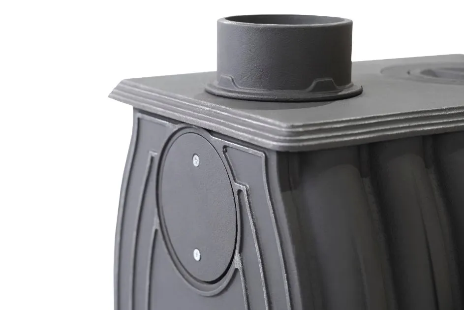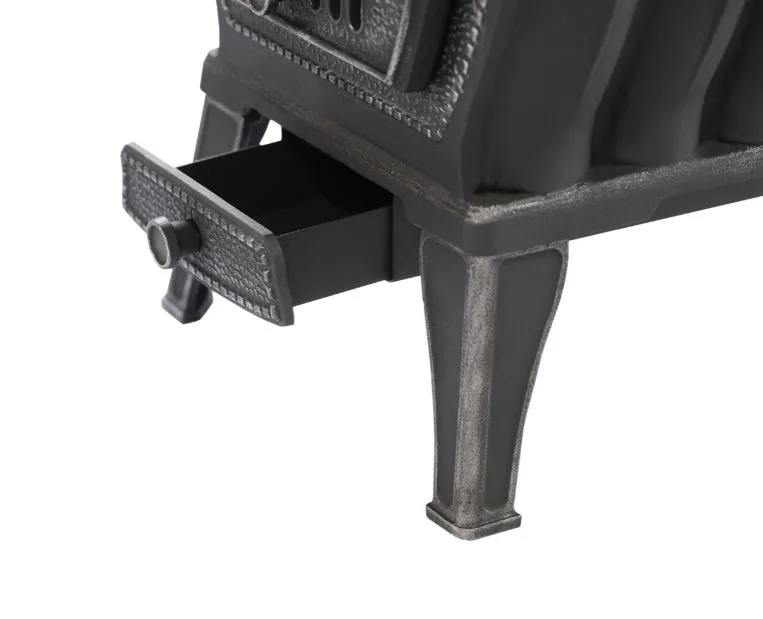 Механизм запирания надежно фиксирует дверку простым поворотом ручки. Емкий зольный ящик позволит быстро и аккуратно удалить золу. В конструкции предусмотрено универсальное подключение дымохода, как сверху, так и к задней стенке печи при помощи съемного патрубка диаметром 130 мм. Это обеспечивает дополнительное удобство при установке и монтаже печи. Особые конструкционные решения обеспечивают экономный расход топлива, а наличие варочной поверхности с чугунными конфорками позволяет использовать печь для разогрева воды и приготовления пищи.