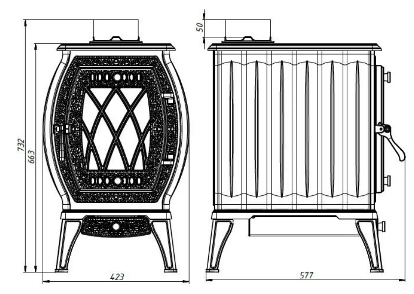 составляет 60 литра, что позволяет загружать топочную камеру комфортным запасом дров и не производить их докладку в течение длительного времени