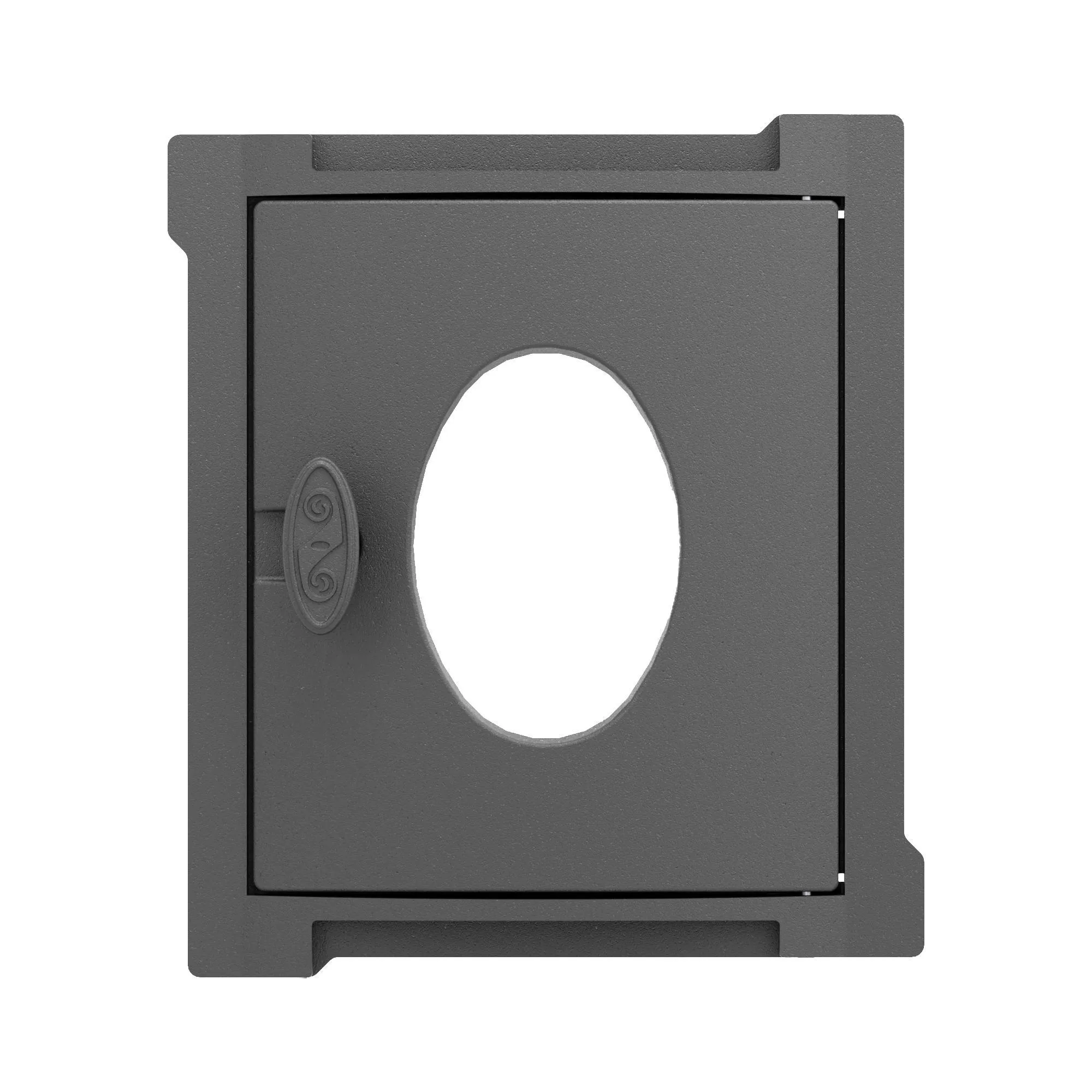 Прижимной механизм обеспечивает плотное прилегание крышки к рамке, исключая зазоры и предотвращая потерю тепла. Дверца изготовлена из высококачественного чугуна, окрашена в черный цвет. В комплект входит базальтовый шнур для герметизации. Стекло устанавливается при желании, что позволяет при необходимости использовать глухую металлическую вставку.