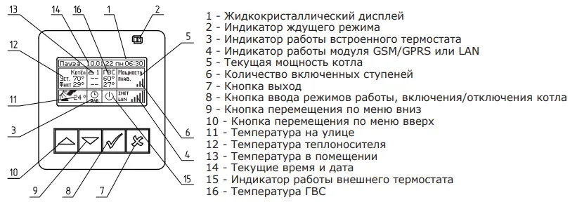 Котел можно использовать для нагрева теплоносителя в системах «тёплый пол». Запрещается установка котла в сетях, совмещённых с центральным отоплением без применения развязывающего теплообменника. В котле имеется встроенный термостат с часами реального времени. Термостат работает по трем заранее запрограммированным режимам: «рабочий день» – «выходной день» – «недельный цикл».