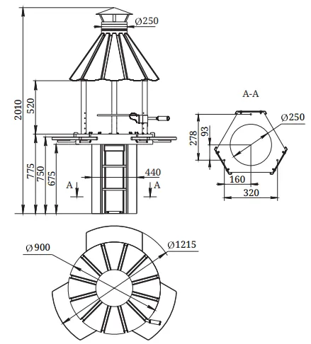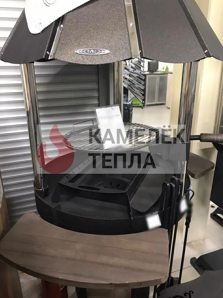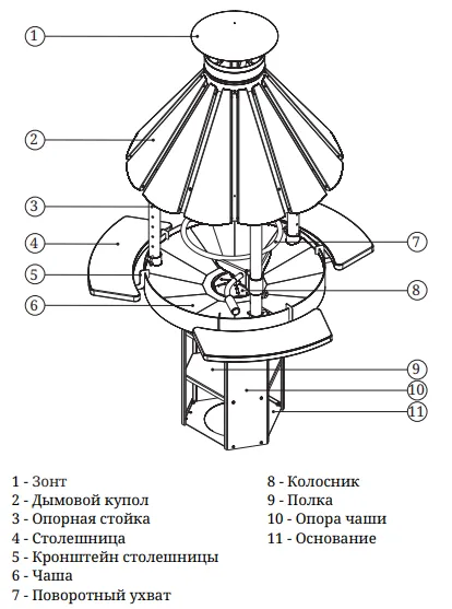 Вокруг чаши размещены три удобных деревянных пристолья округлой формы, куда можно положить продукты, посуду и утварь. Пристолья обработаны защитным составом. Они закреплены таким образом, что к грилю можно легко подойти с разных сторон. Сверху чаши-жаровни, на трех вертикальных трубчатых опорах, установлен конический дымовой купол с выходом дымохода и зонтиком. Лепестковая конструкция купола придает красивый внешний вид грилю и лаконично впишется в экстерьер вашего приусадебного участка.
