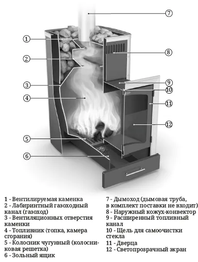 Оригинальный лабиринтный газоход обеспечивает мощный скоростной нагрев парилки объемом до 30 м и качественный прогрев каменной закладки массой около 100 килограммов