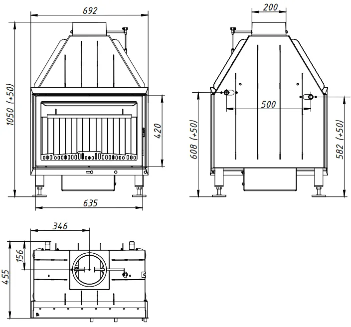 В комплекте поставляются ножки для установки каминной топки в рабочее положение. Отрегулировать нужную вам высоту топки можно при помощи болтов находящихся в нижней части топки.