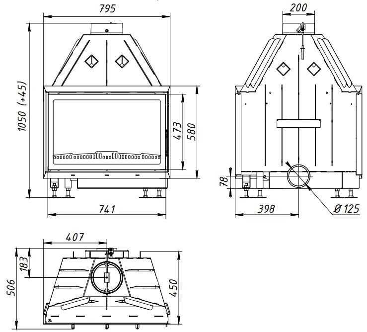 В комплекте поставляются ножки для установки каминной топки в рабочее положение. Отрегулировать нужную вам высоту топки можно при помощи болтов находящихся в нижней части топки.