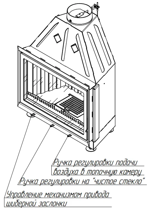 Теплопроизводительность камина (мощность) регулируется путем изменения подачи количества воздуха в топочную камеру, через систему подачи воздуха на горение, систему очистки стекла, системой вторичного дожигания, а также увеличением/ уменьшением сечения дымового канала путем регулирования шиберной заслонкой и количеством дров