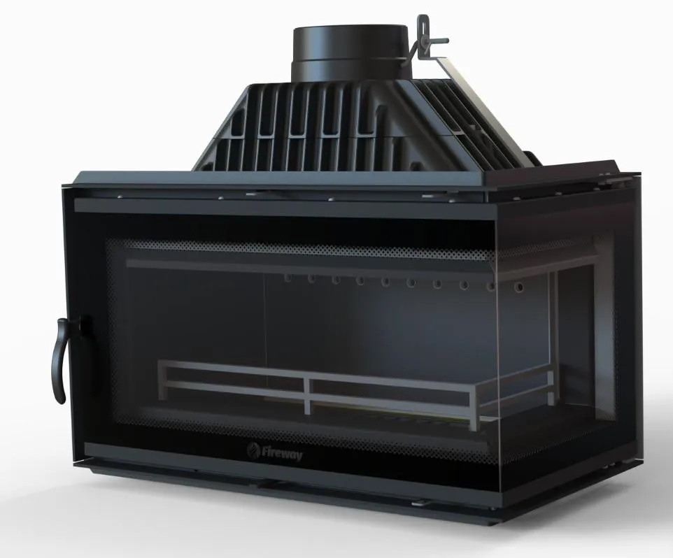 Топка выполнена по принципу колосникового горения с чугунной футеровкой на задней стенке и зубе, колосниковой решёткой в нижней части и выносным зольным ящиком за общей дверцей. Дверца оснащена двойным огнеупорным стеклом, выдерживающим температуру до 700°C, обеспечивающим безопасный обзор пламени и максимальную тепловую отдачу. Система распределённой подачи воздуха включает первичный приток через колосник и вторичный дожиг через отверстия в верхней части задней стенки. Интегрированная система «чистое стекло» направляет управляемый поток воздуха сверху дверцы, предотвращая закопчение стекла и одновременно выполняя функцию дожига дымовых газов. Возможна топка дровами длиной до 55 см. Съёмный вертикальный гребень служит ограничителем дров в топочной камере.