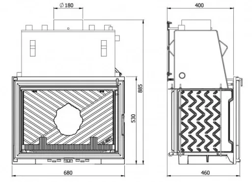 Короб водяного камина - это водяной контур, под которым размещены трубы, соединенные с водяным пространством через боковые стенки камеры сгорания. Задание труб - обеспечить соответствующую площадь теплообмена и улучшить циркуляцию воды в водяном пространстве топки. Во время нормальной эксплуатации после разжигания продукты горения, омывая стенки камеры топки, после этого - нишу и внешние поверхности труб, выходят к главному дымовому каналу, а оттуда выходят к коробу и дымоходу. Возвращение “холодной” воды из системы к водяному камину происходит с помощью нижних штуцеров (левого или правого), впаянных в боковые стенки водяного контура. Отвод подогретой воды из водяного контура происходит через левый или правый (противоположный возвращению) верхний выпускной штуцер