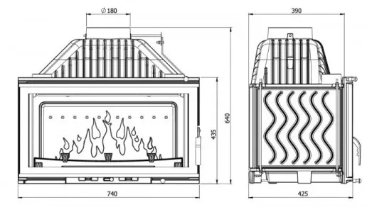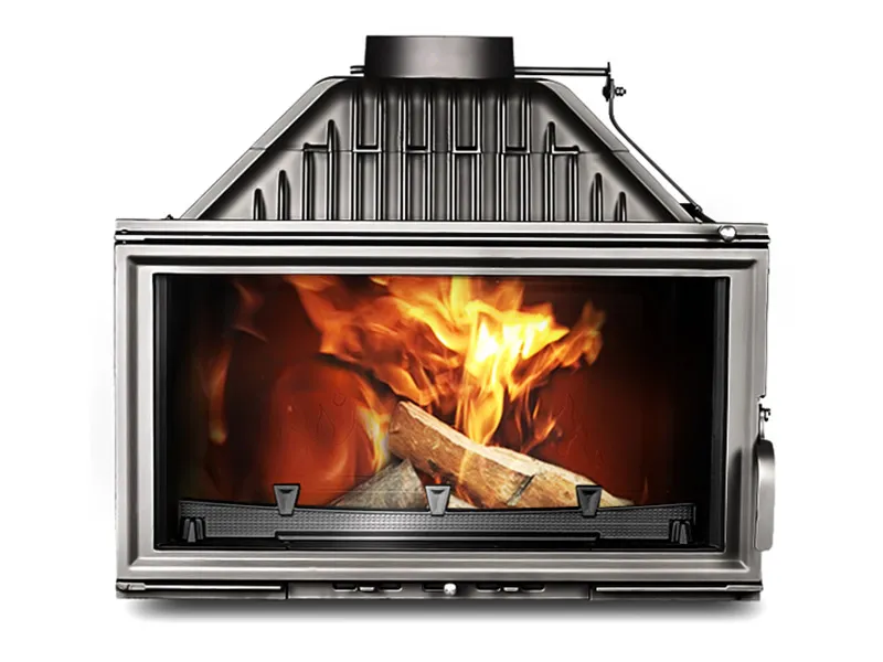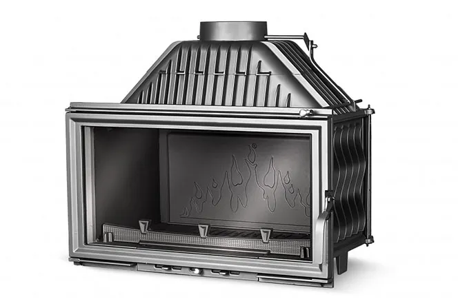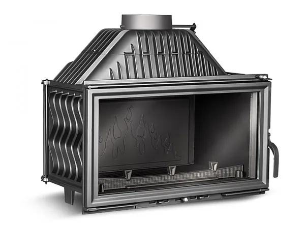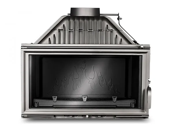 Характеризуется высоким показателем коэффициента полезного действия – загрузка сухих дров позволяет получить КПД в пределах 72%. При относительно скромных габаритах обладает высокой мощностью. Плотно расположенные радиаторы для увеличения площади теплоотдачи в помещение. Дополнительная жаростойкая плита, которая предохраняет корпус каминной топки от износа. Декоративная решетка, которая препятствует выпадению дров из топки камина.