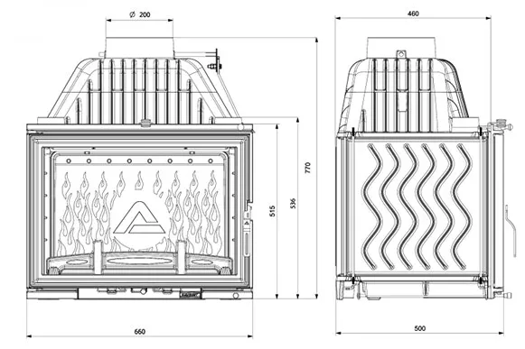 Характеризуется высоким показателем коэффициента полезного действия – загрузка сухих дров позволяет получить КПД в пределах 70%. При относительно скромных габаритах обладает высокой мощностью. Плотно расположенные радиаторы для увеличения площади теплоотдачи в помещение. Дополнительная жаростойкая плита, которая предохраняет корпус каминной топки от износа. Декоративная решетка, которая препятствует выпадению дров из топки камина.