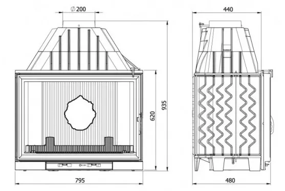 Характеризуется высоким показателем коэффициента полезного действия – загрузка сухих дров позволяет получить КПД в пределах 71%. При относительно скромных габаритах обладает высокой мощностью. Плотно расположенные радиаторы для увеличения площади теплоотдачи в помещение. Дополнительная жаростойкая плита, которая предохраняет корпус каминной топки от износа. Декоративная решетка, которая препятствует выпадению дров из топки камина.