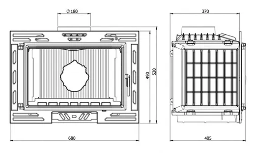 Характеризуется высоким показателем коэффициента полезного действия – загрузка сухих дров позволяет получить КПД в пределах 66%. При относительно скромных габаритах обладает высокой мощностью. Плотно расположенные радиаторы для увеличения площади теплоотдачи в помещение. Дополнительная жаростойкая плита, которая предохраняет корпус каминной топки от износа. Декоративная решетка, которая препятствует выпадению дров из топки камина.