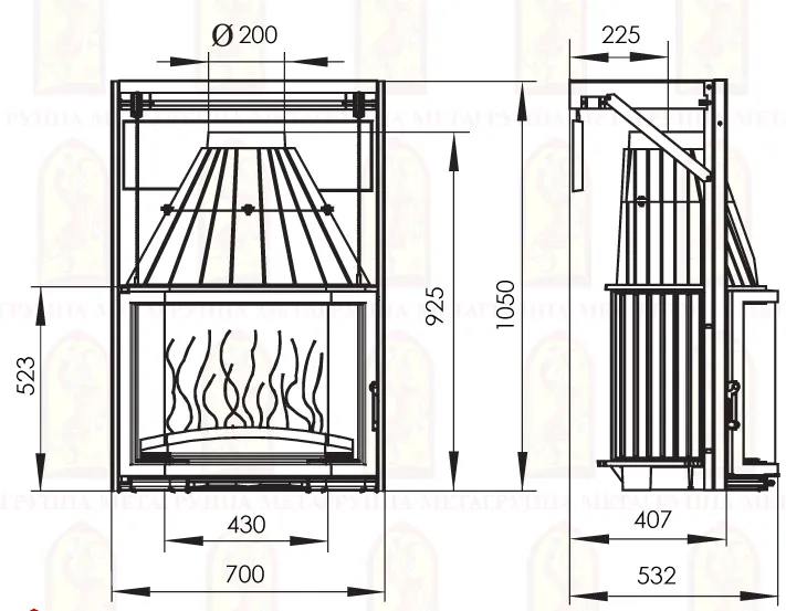 Большое стекло призматической формы позволяет наблюдать за процессом горения. Узор на задней стенке топки в форме пламени радует глаз