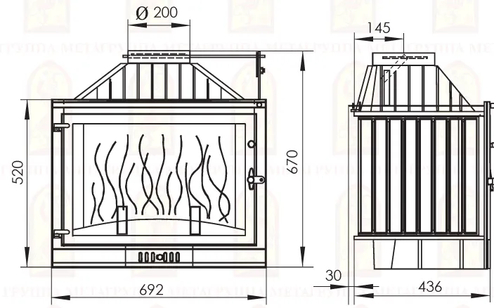 Каминная топка изготавливается из чугуна, что даёт ей прекрасные характеристики: особую стойкость к тепловым нагрузкам, долговечность в эксплуатации и очень хорошая теплоотдача