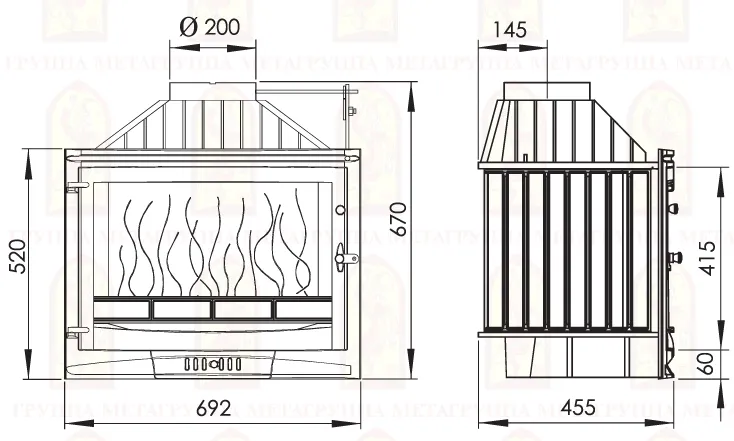 Каминная топка изготавливается из чугуна, что даёт ей прекрасные характеристики: особую стойкость к тепловым нагрузкам, долговечность в эксплуатации и очень хорошая теплоотдача