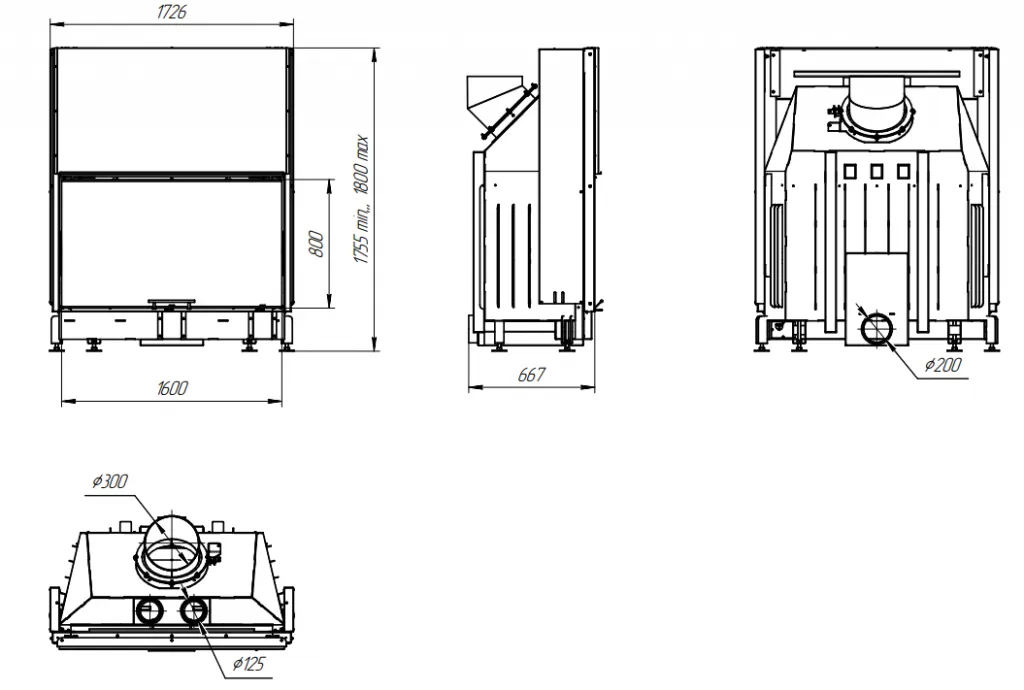 Каминная стальная топка ВЕГА 1600 B чёрный шамот подовое горение