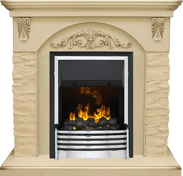 Каминокомплект Bern Сланец крупный бежевый / Алебастр темная патина с очагом Flagstaff