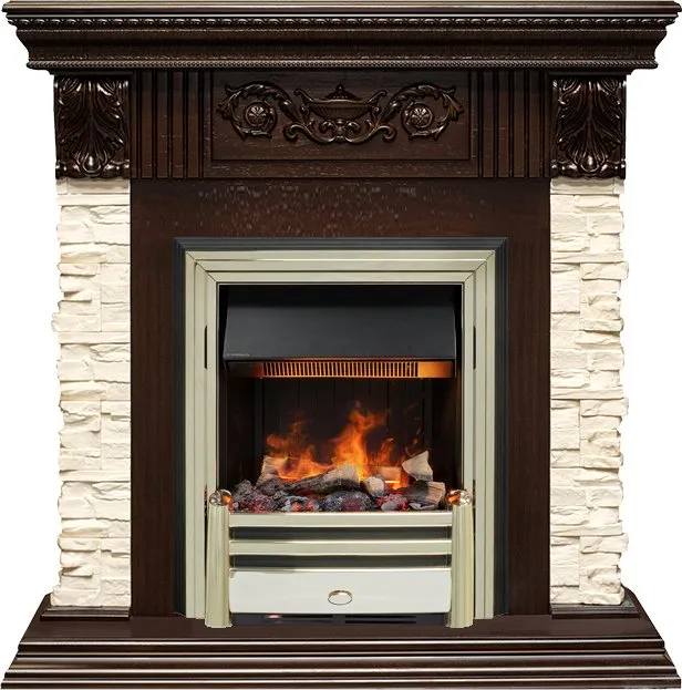 Электрокамин выполнен в золотом цвете. Золото – это материал, который никогда не выйдет из моды, это свидетельство безупречного вкуса и верности традициям. Цвет золота подчёркивает неповторимый стиль и необычность этого камина. К очагу можно подобрать любой портал, который подойдет к вашему интерьеру и станет его лаконичным продолжением. В очаге Dimplex Cavendish применяется эффект «живого» пламени Opti-Myst, в основу которого заложен инновационный принцип имитации огня - в очаге мерцает пламя, практически неотличимое от настоящего. В камине используется муляж дров ручной работы, которые невозможно отличить от настоящих поленьев, а благодаря подсветке создается полная имитация жарко пылающего очага.
