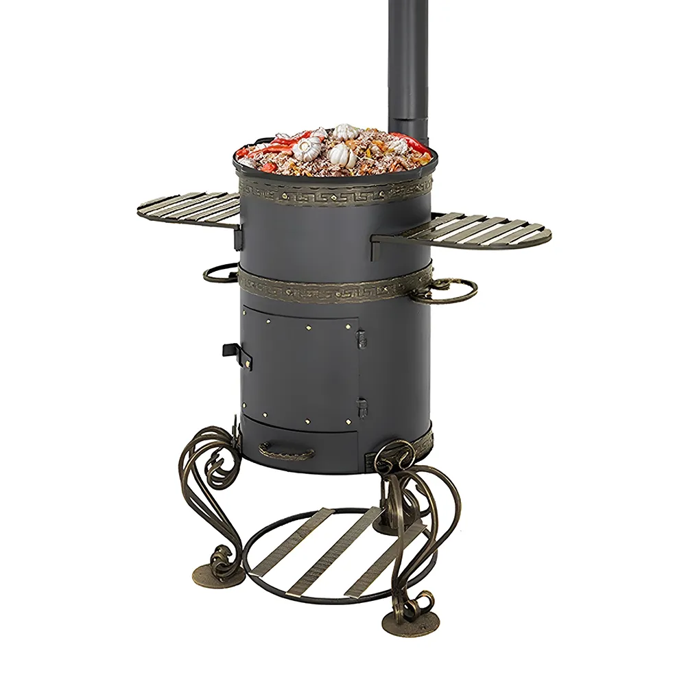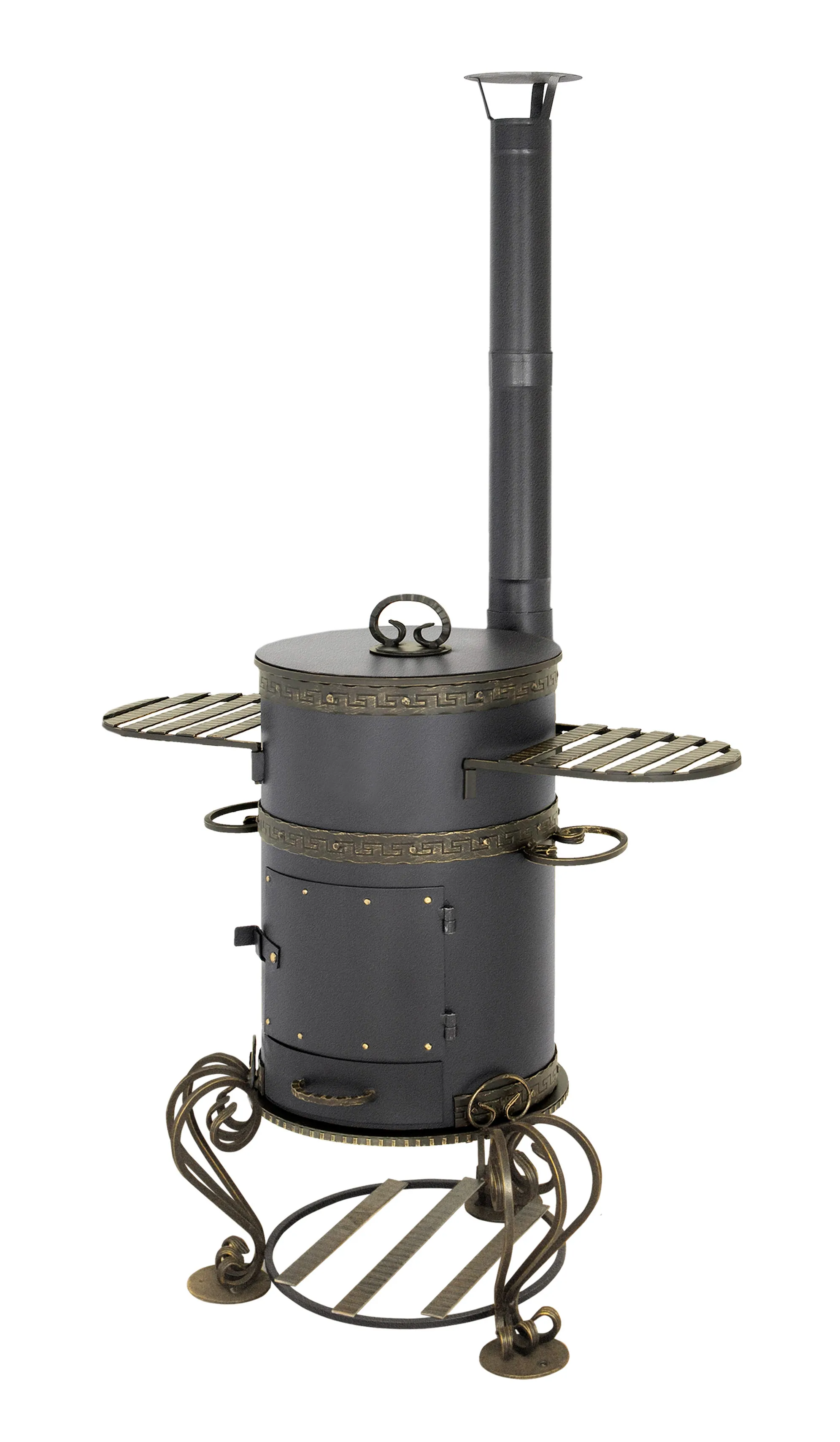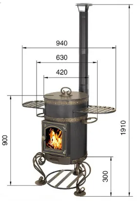 Печь оснащена вытяжной трубой самоварного типа. Благодаря этому образующийся дым поднимается высоко в воздухе и не мешает окружающим. Колосниковая решётка и выдвижной зольный ящик позволяет легко и быстро удалять золу при горящей печи. Также его можно использовать для регулирования интенсивности горения дров в топке.
