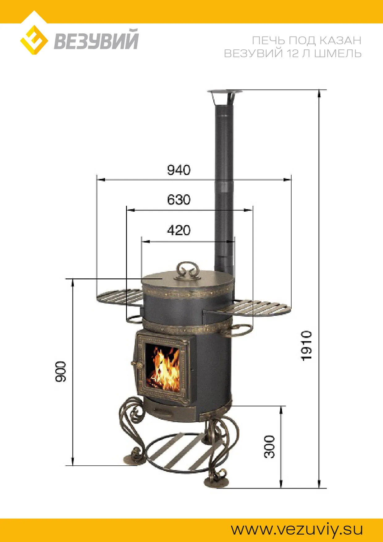 Печь под казан для приготовления еды на свежем воздухе. Объем казана 12 литров хватает для того, чтобы накормить обедом всех членов большой семьи. С двух сторон печь оборудована двумя полочками. Внешне они напоминают крылья шмеля, за что печь и получила свое название.