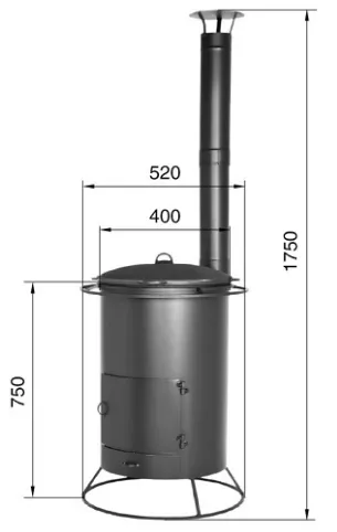 Печь под казан с трубой малая предназначена для приготовления пищи под открытым небом, благодаря тому, что печь под казан имеет высокую вытяжную трубу самоварного типа. Дым, выходящий из трубы, не мешает окружающим. Колосниковая решётка, выполненная из жаропрочного чугуна, выдвижным зольным ящиком позволяет удалить золу при работающей печи. Так же выдвижной зольный ящик дает возможность регулировать интенсивность горения дров в топке.