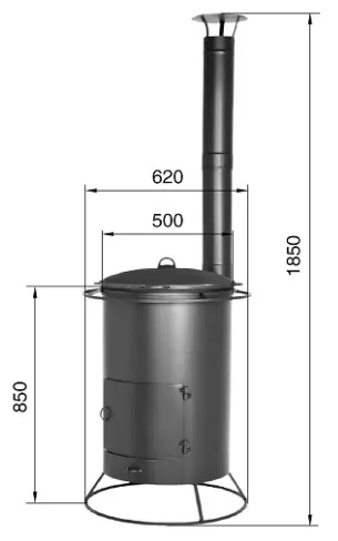 Печь под казан с трубой малая предназначена для приготовления пищи под открытым небом, благодаря тому, что печь под казан имеет высокую вытяжную трубу самоварного типа. Дым, выходящий из трубы, не мешает окружающим. Колосниковая решётка, выполненная из жаропрочного чугуна, выдвижным зольным ящиком позволяет удалить золу при работающей печи. Так же выдвижной зольный ящик дает возможность регулировать интенсивность горения дров в топке.