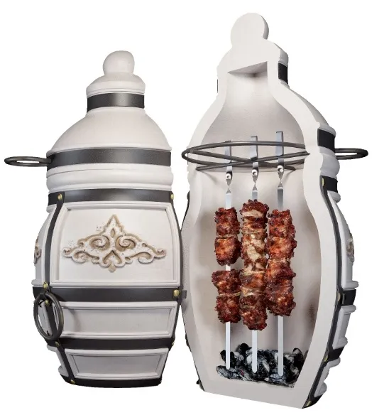 Тандыр "Александр" выполнен в виде округлого бочонка большого объёма. Тандыр имеет крышки двух уровней (колпачок и крышку). Удобно выполненный колпачок, позволяет не терять тепло при открывании тандыра. А крышка с удобными ручками позволяет легко открывать тандыр и закладывать в него продукты для приготовления. Кованная подставка - ножки обеспечивает удобное использование тандыра.