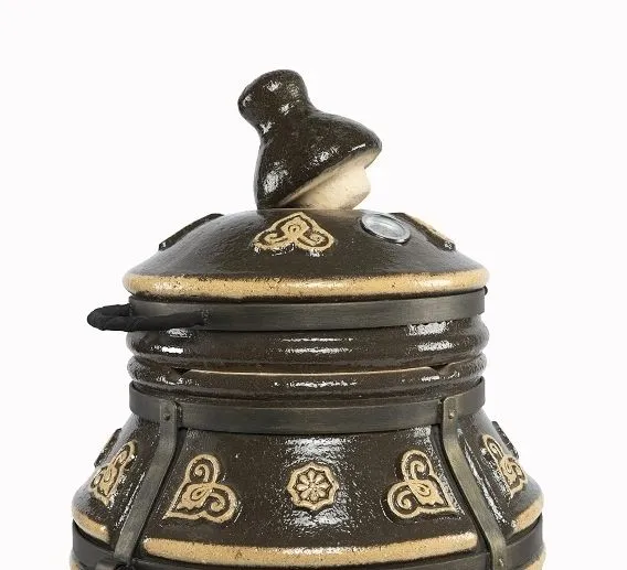 Тандыр покрыт глянцевой глазурью с орнаментом. Ручки – натуральная кожа.